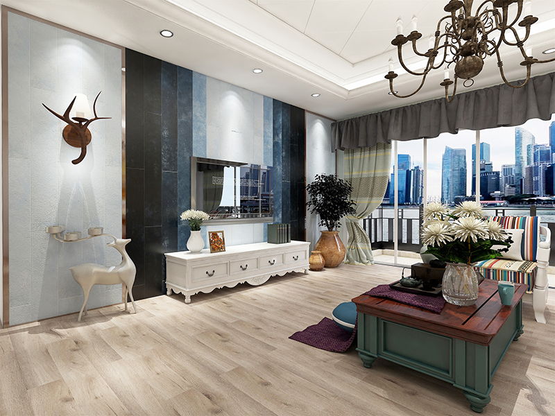 該業主的房屋設計風格主要為簡歐風,客廳吊頂采用了石膏板分塊,并且運用了歐式石膏線,為突出簡歐風,沙發是簡約造型帶歐式皮面。電視背景墻采取了傳統歐式壁爐造型,上方鋪貼了簡約風格的文化石,兩側定制了展示柜,增加文化氣息。