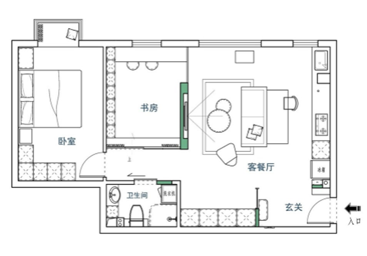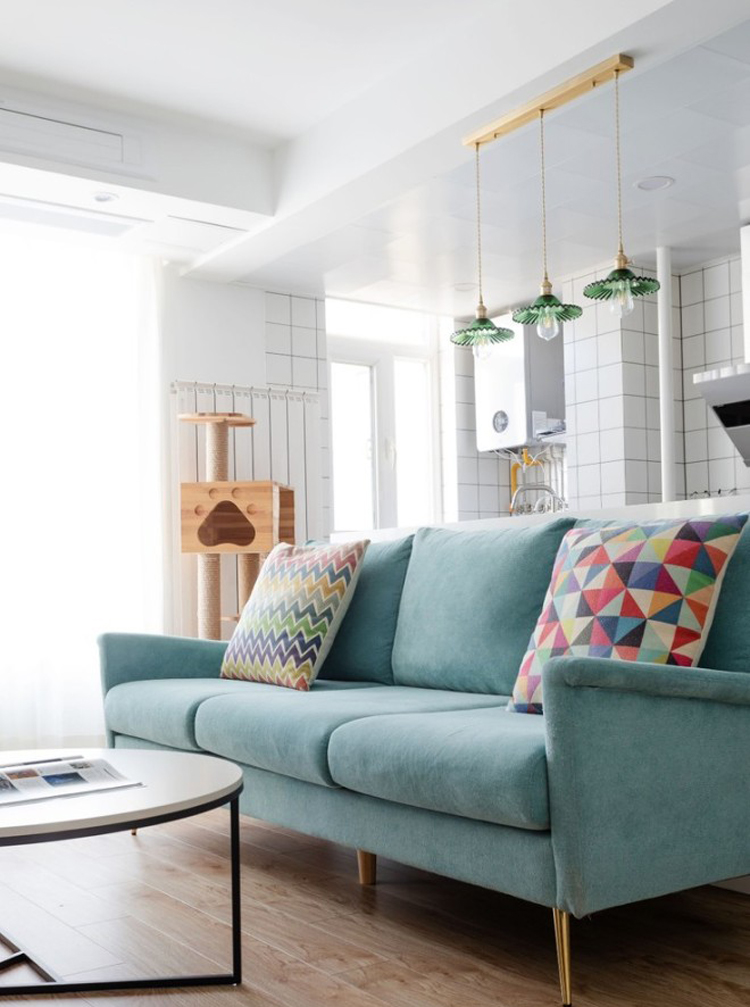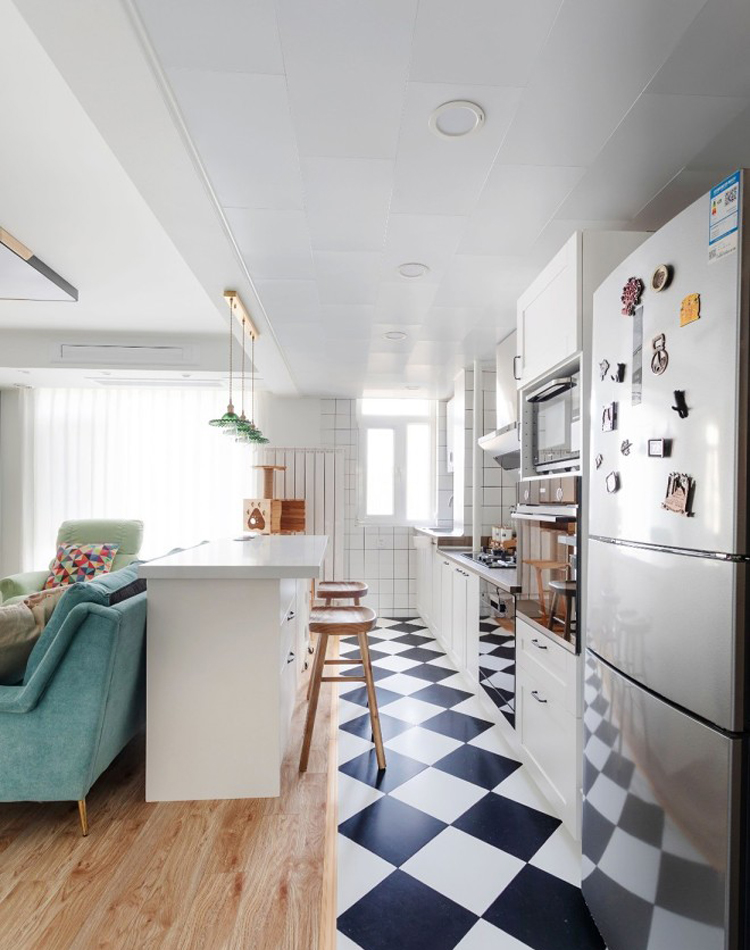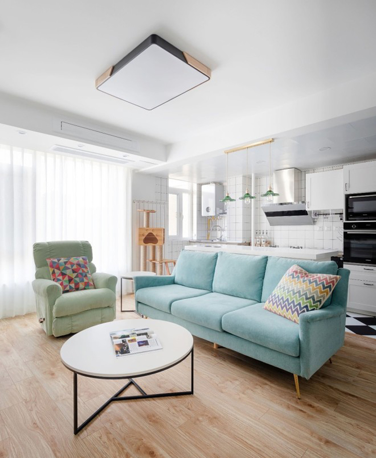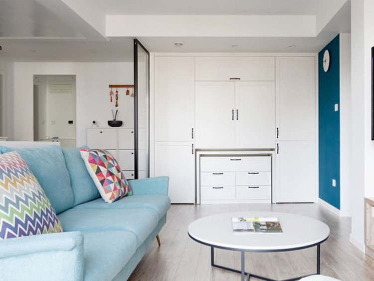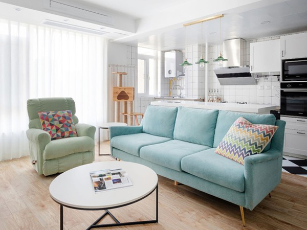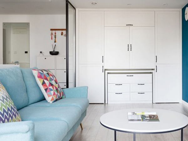 客廳和廚房打通,形成開放式廚房。沙發后面的吧臺可以多功能使用,平時可當操作臺、餐吧臺,同時也可以作為業主回來加班辦公的工作臺。