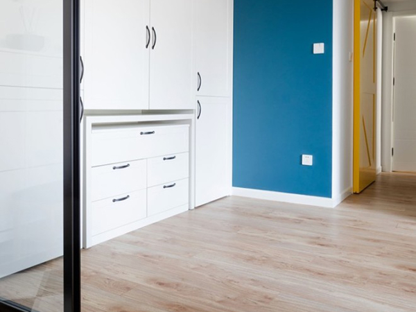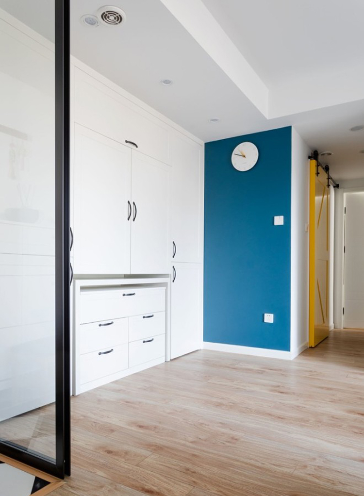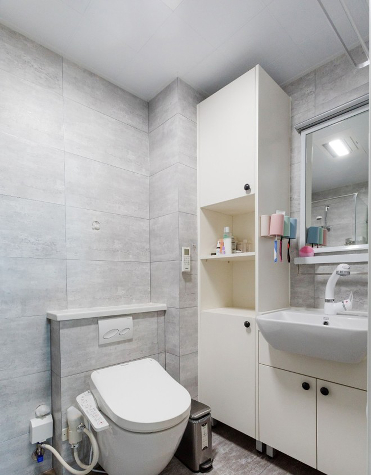 浴室柜和儲物高柜連為一體,囤積的衛生用品可收納在帶柜門的柜體里,空格柜里擺放日常護膚品。