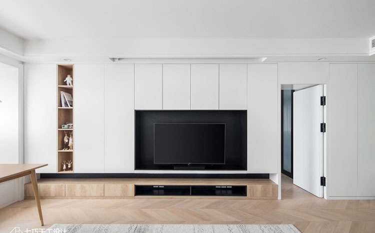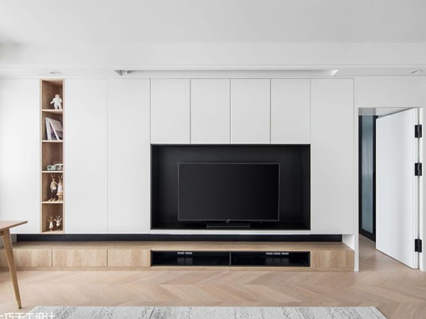 1. 在客廳電視背景墻的位置定做整面通高柜體增加儲物,主臥以隱形門的形式進入。