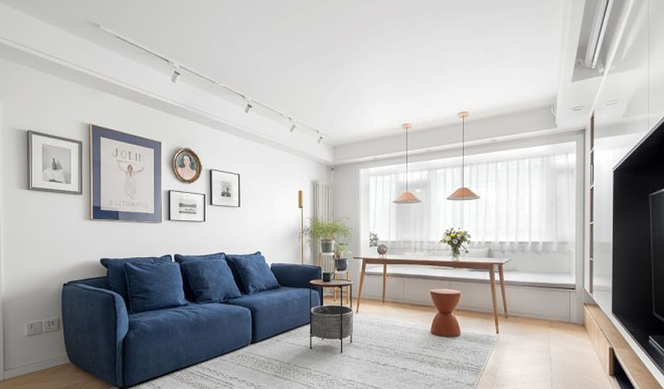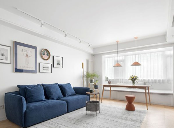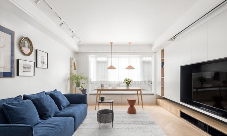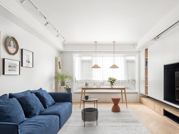 重新規劃后將餐廳由狹小的過道移至客廳,除了用餐之外,家人也可以圍坐在此一起畫畫做手工等,客廳陽臺位置以榻榻米的形式增大儲物,同時也可以允許多人同時使用餐桌。
