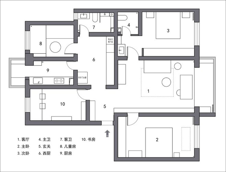 本案的業主是一個三口之家,由于孩子年紀還比較小,所以會有老人幫忙帶。在設計初期,我們考慮到,要在保證現在家人正常居住的情況下,也要為多年以后的生活狀態提前進行規劃,要預留出第二個娃兒成長的空間。果然在裝修還未完全結束的時候,我們就有幸見證了二娃的出生,同時也看到大娃兒在兒童房里快樂的玩耍,很是欣慰。