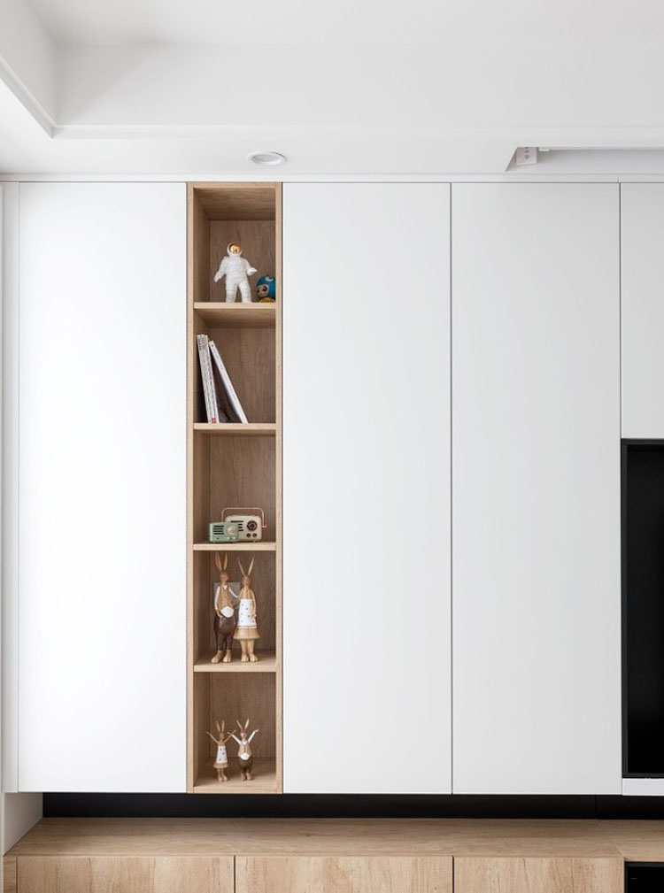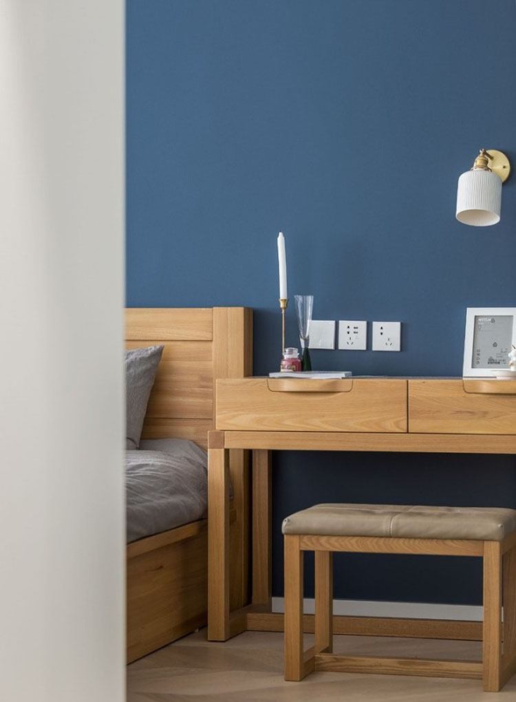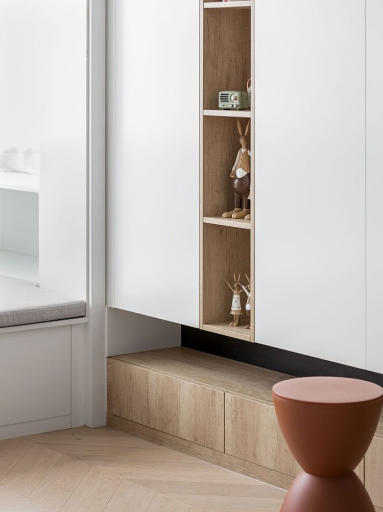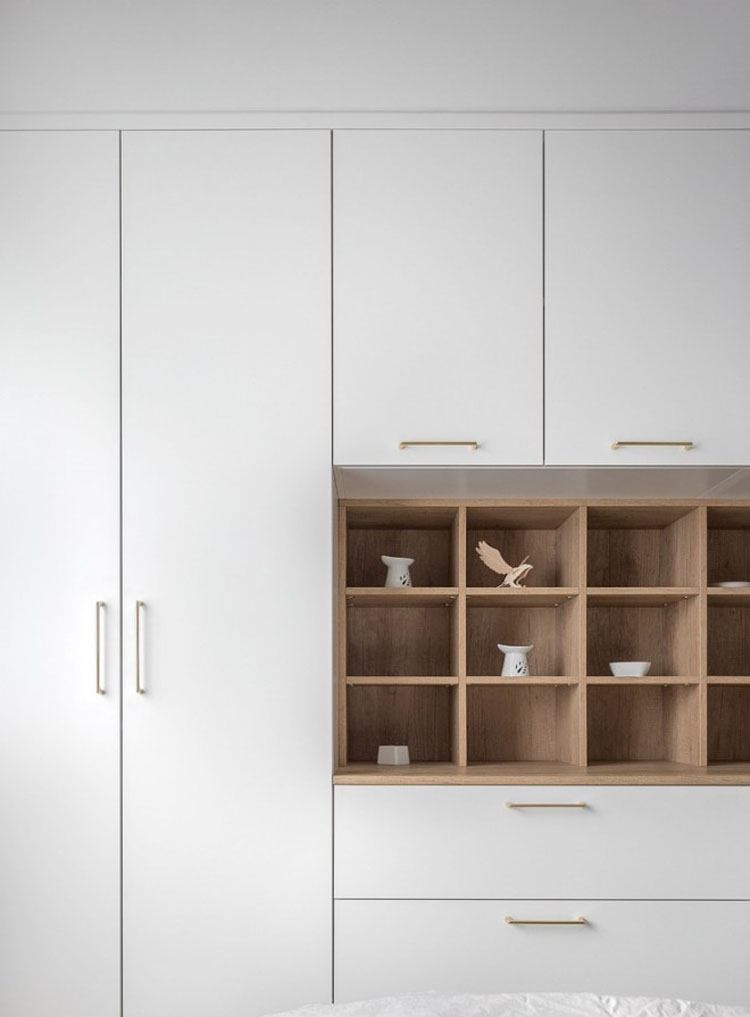 床尾的衣柜,中間嵌入木色格子柜,格子柜深度只占衣柜進深的一半,剩余的一半空間還可以放一些高尺寸的東西,比如晚上的水壺。
