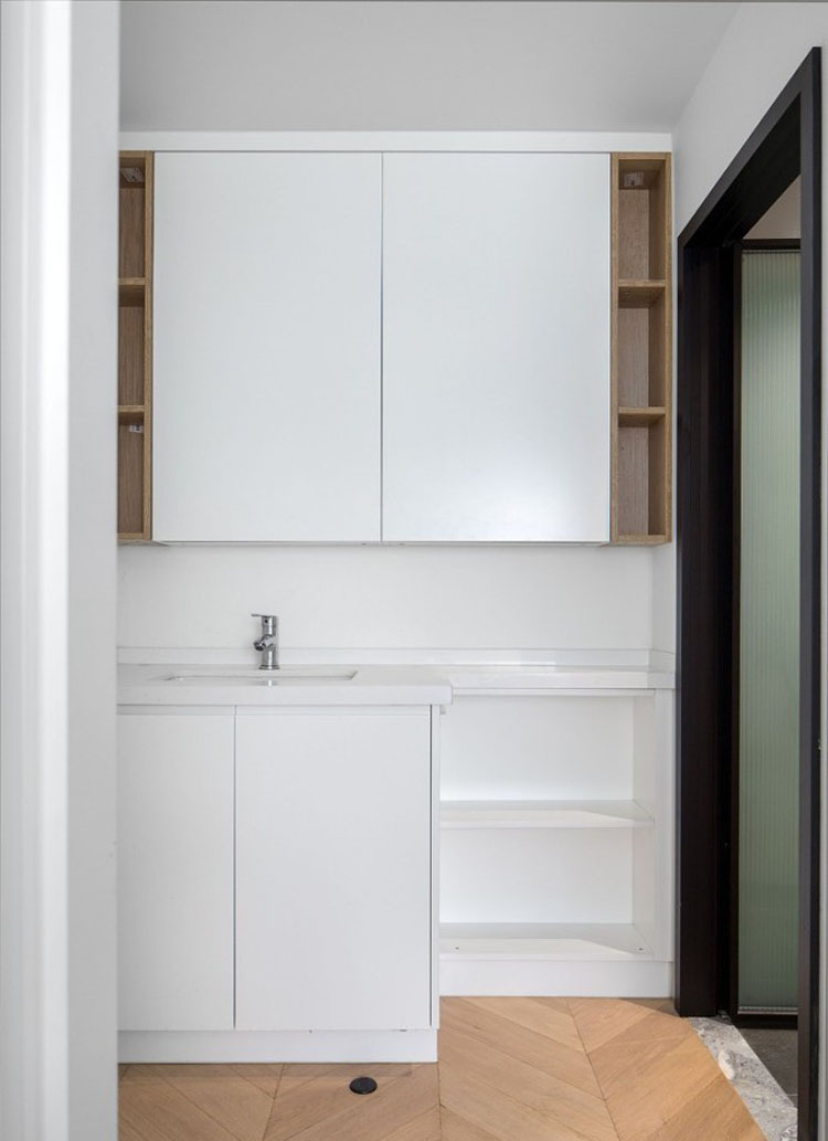 次臥的衛生間做了干濕分離,因為洗手區是在臥室內,所以特意定制了在柜門內側的鏡子,避免晚上老人起夜受到影響。