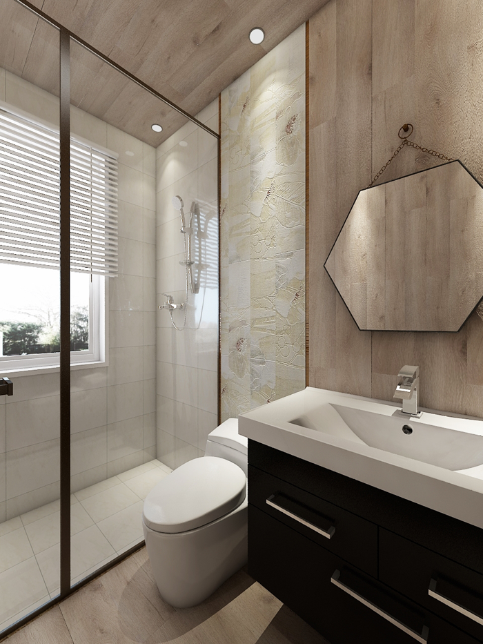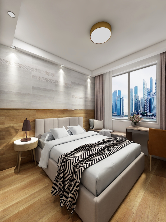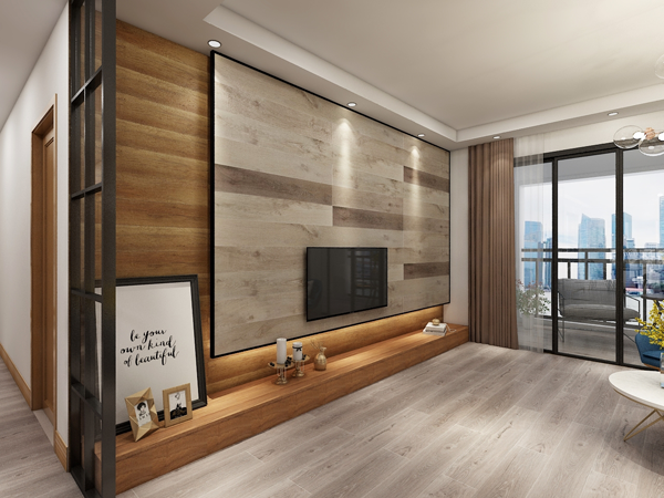 客廳,全木空間的定制打造,墻面選用MOH24936123(YS1822A)、MCZ21600909兩個型號的墻板,配以MGC22960972(C193005)的地面,大理石紋理的背景墻板簡潔自然。